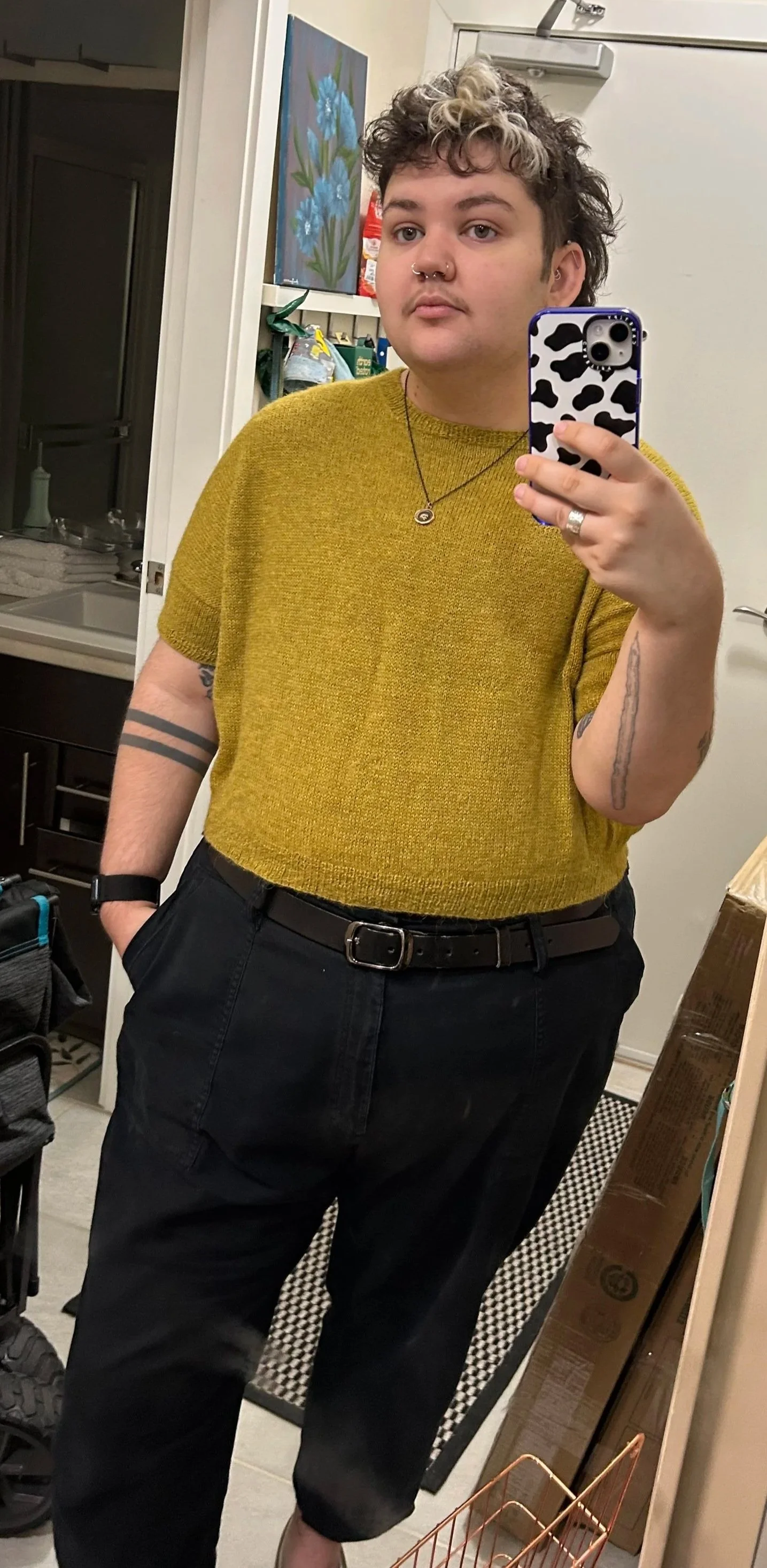 Hey folks, I’m Sam. I’m a 26 year old disabled artist whose art is as brightly coloured as it is likely to feature swear words - which is to say, very. I dabble in many different mediums and subjects depending on my inspiration. I’m known for my prolific ghost painting output, pop culture portraits, and vibrant (yet profane) abstracts. I’m beginning the occasional foray into comics which address more personal topics like gender and disability. This needn’t be said, but just in case, I despise AI of any form. When I’m not creating art you can find me knitting, taking care of the forest worth of plants in my home, spending time with my two dogs Molly and Luna, and sleeping. One of the few perks of being disabled is my dogs and I being on the same nap schedule :) I’m pictured here wearing a t-shirt that I knit for myself on the world’s smallest knitting needles.
